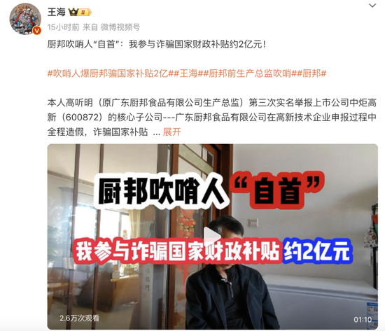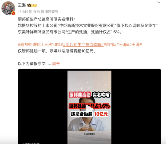 昨日,知名打假人王海连发两则厨邦前生产总监举报视频,分别举报厨邦耗油造假、厨邦在高新技术企业申报过程中造假,诈骗国家补贴2亿元。