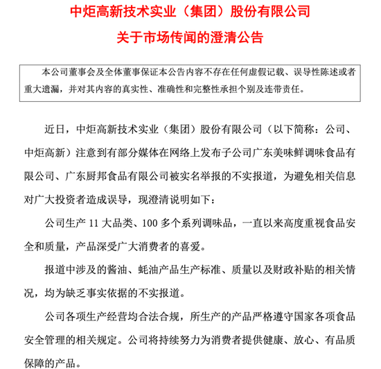 公告显示,近日,中炬高新技术实业(集团)股份有限公司(以下简称:公司、中炬高新)注意到有部分媒体在网络上发布子公司广东美味鲜调味食品有限公司、广东厨邦食品有限公司被实名举报的不实报道,为避免相关信息对广大投资者造成误导,现澄清说明如下: